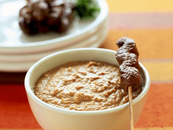 Das pikante Erdnuss-Dip-Rezept passt zu gebratenem Gemüse oder zu Fleischspießen.